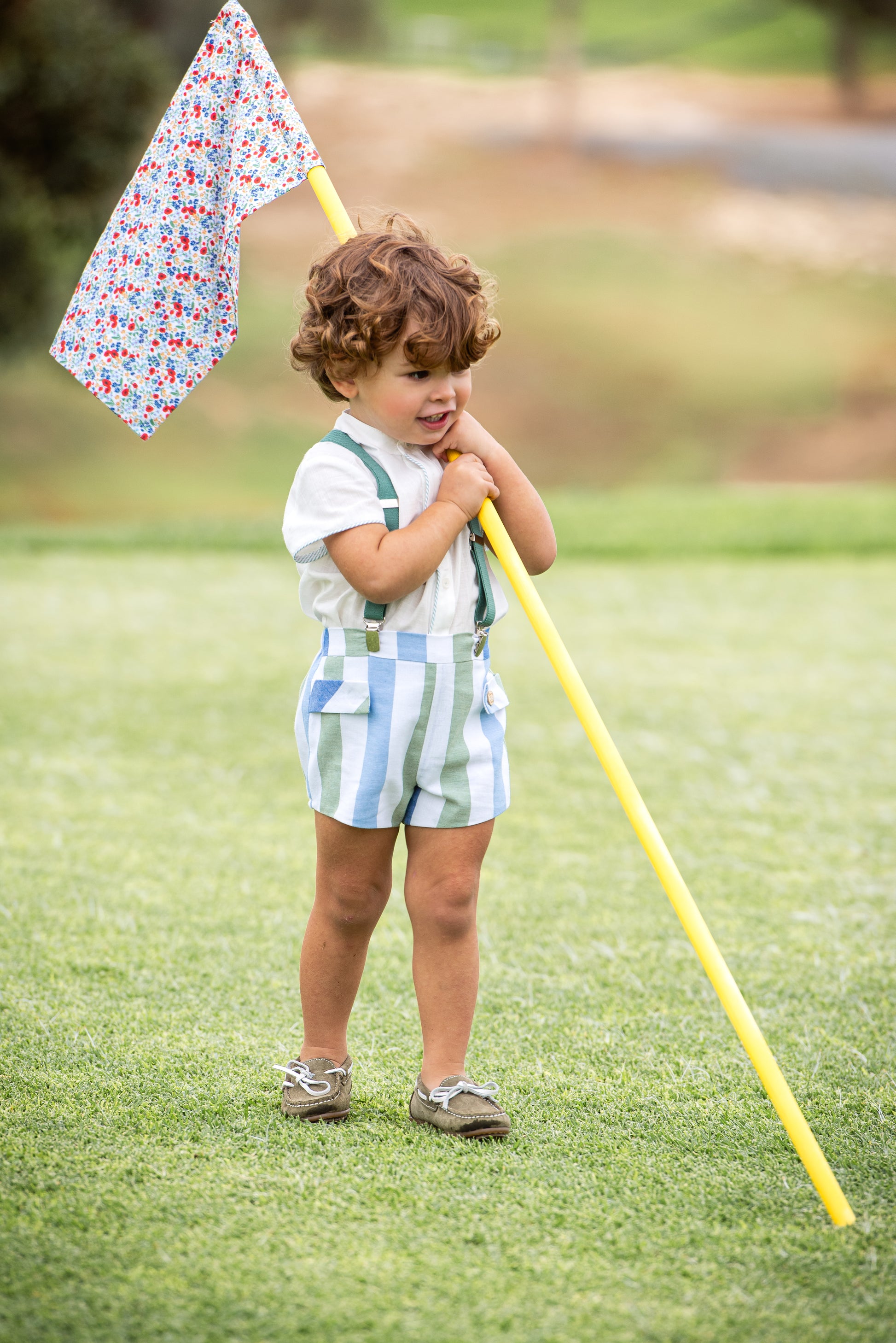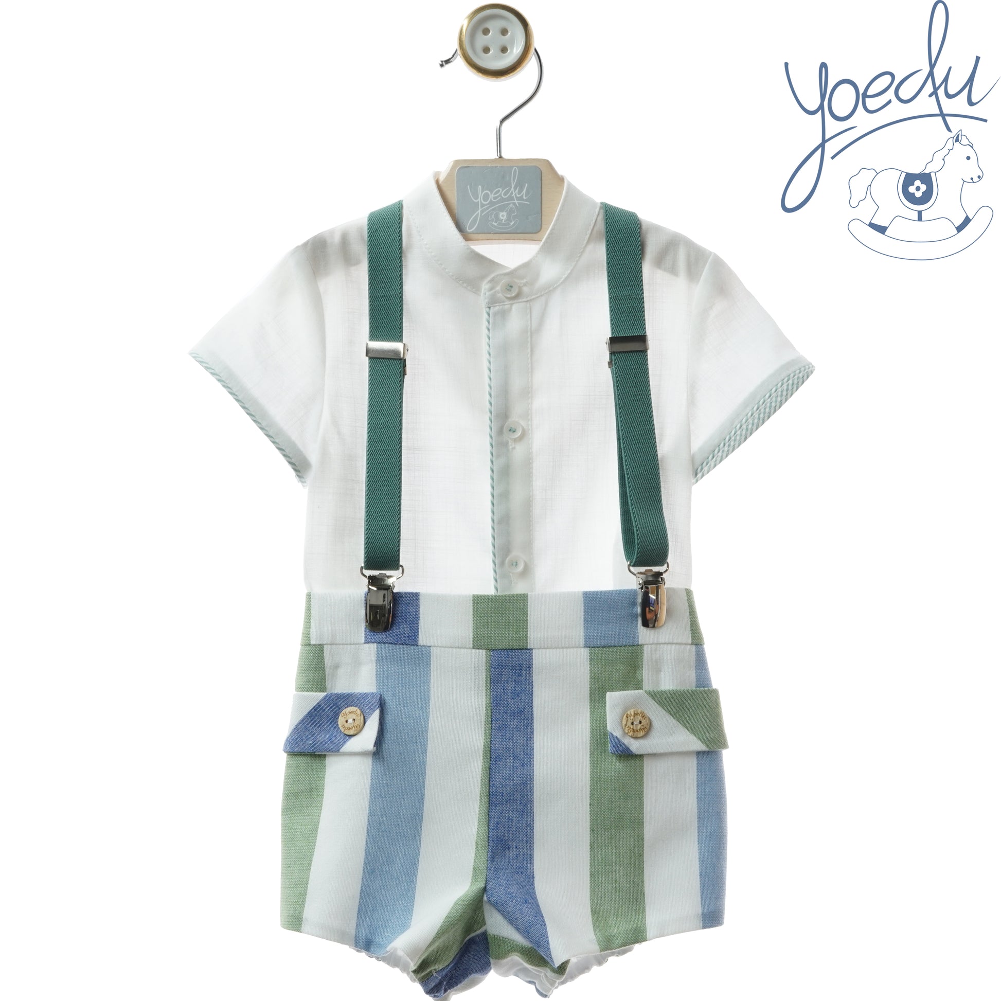 Conjunto de bombacho de rayas con tirantes verdes y blusa.