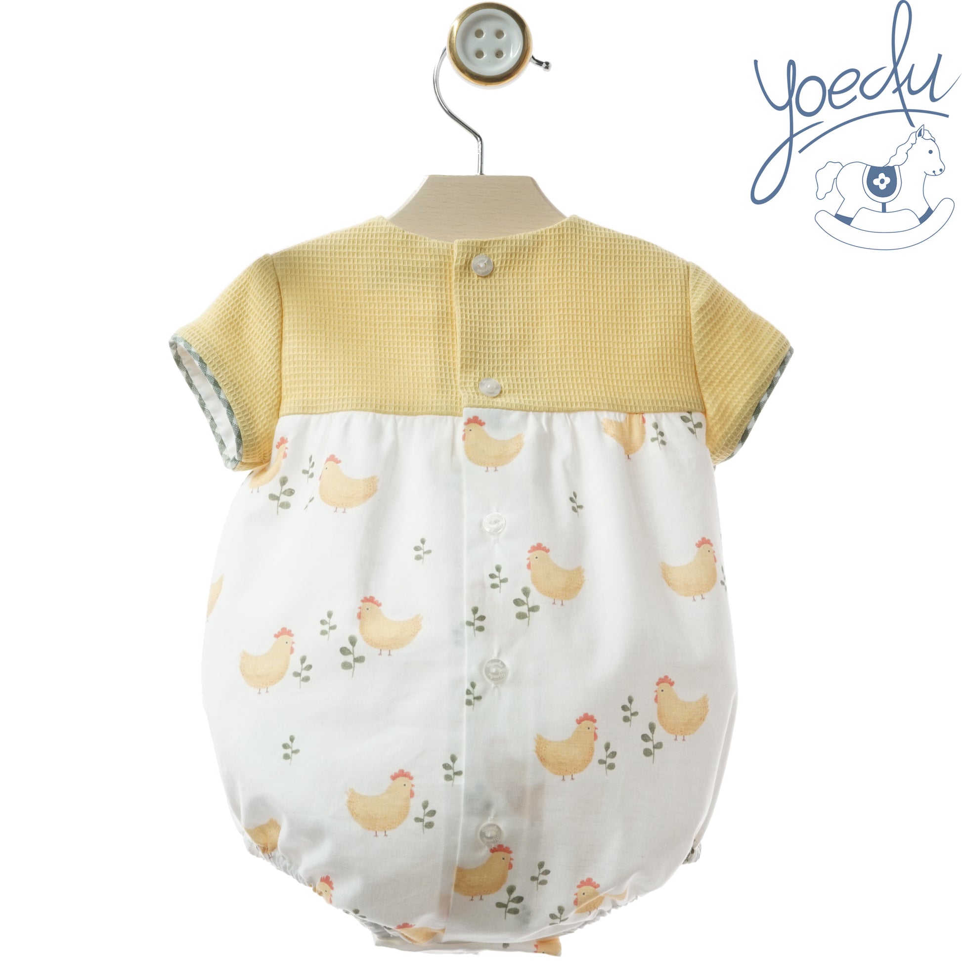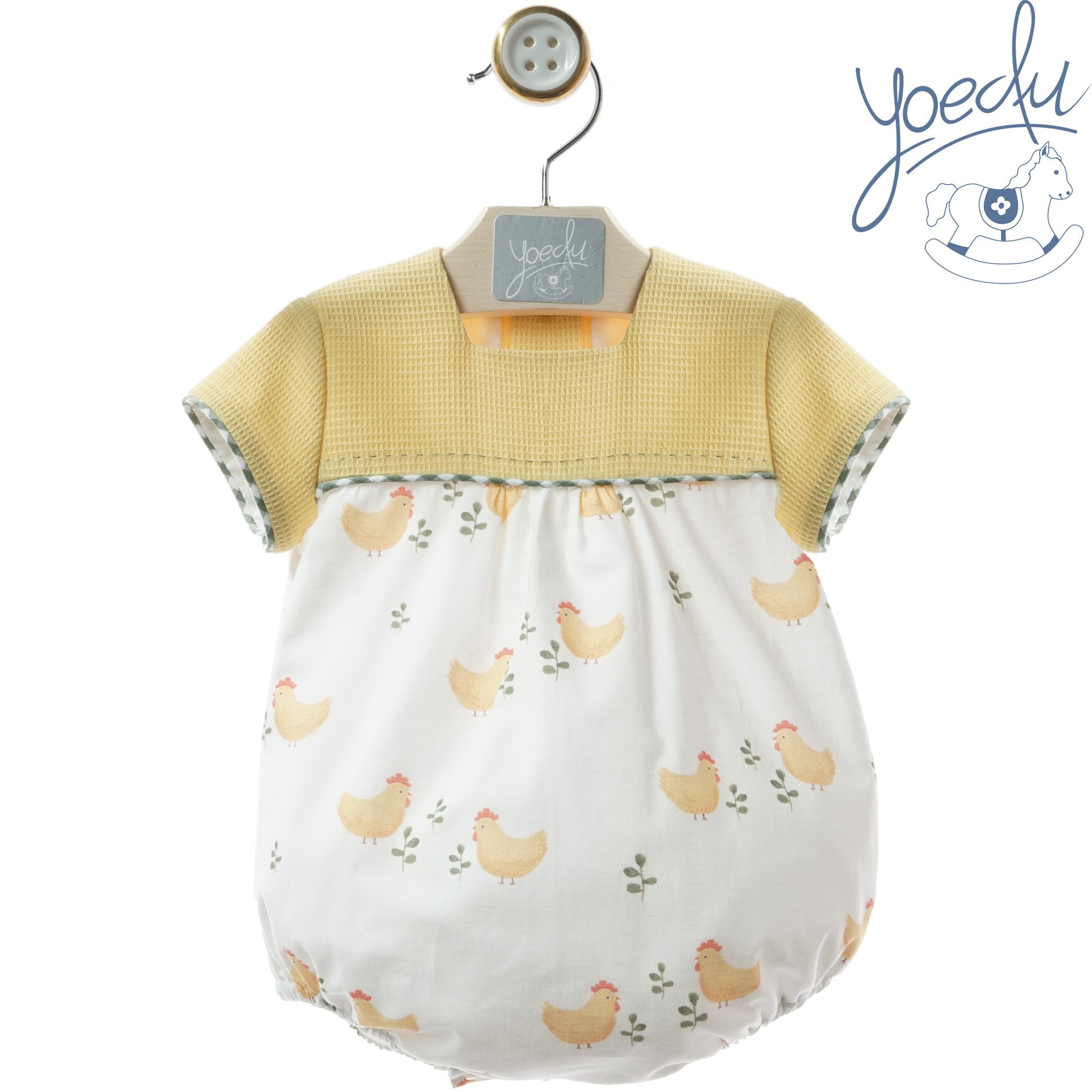 Pelele amarillo con estampado de gallinas.