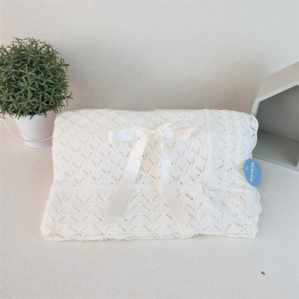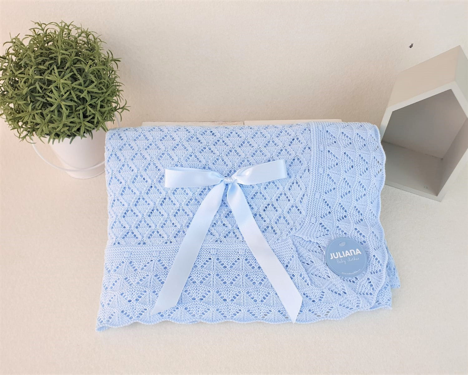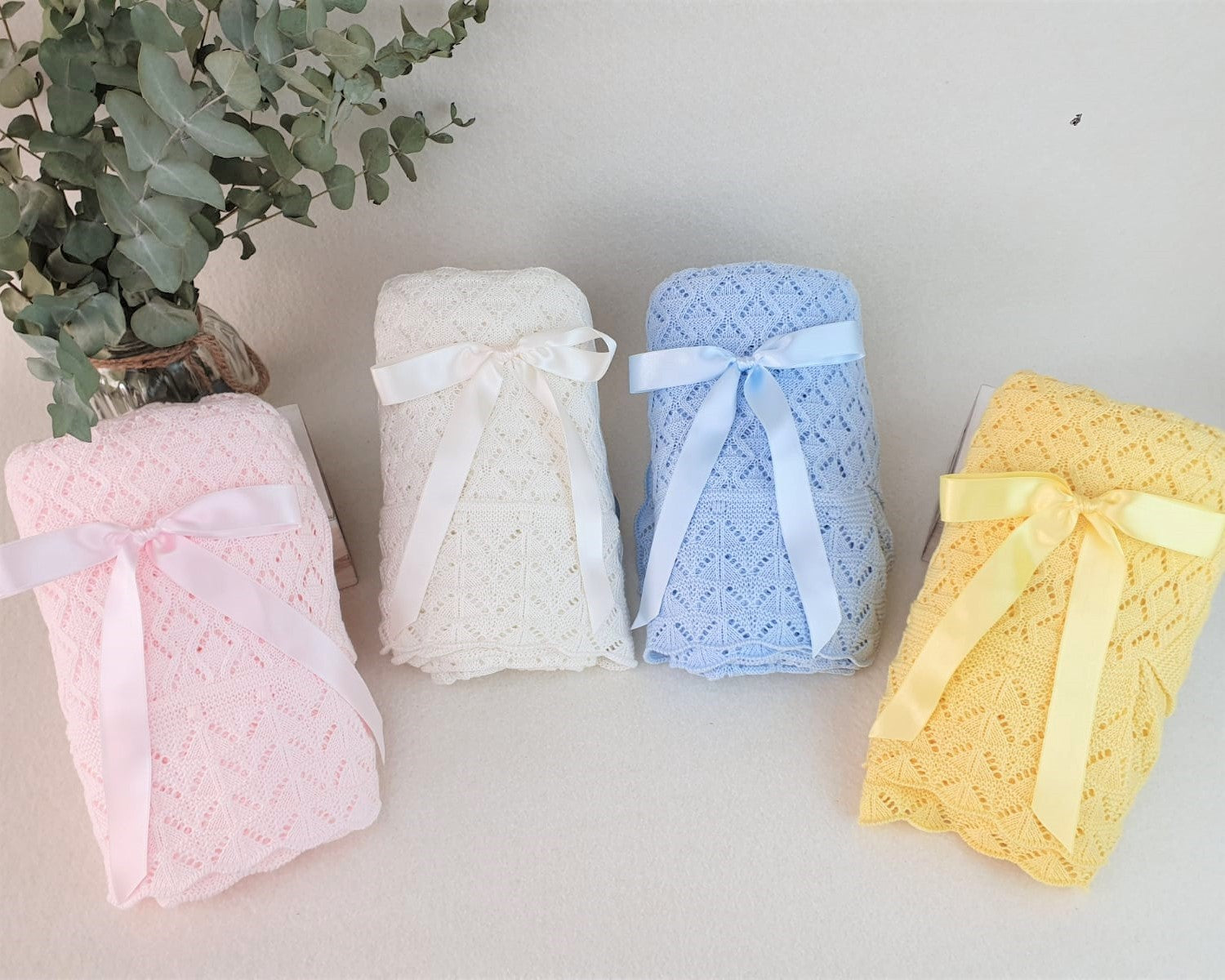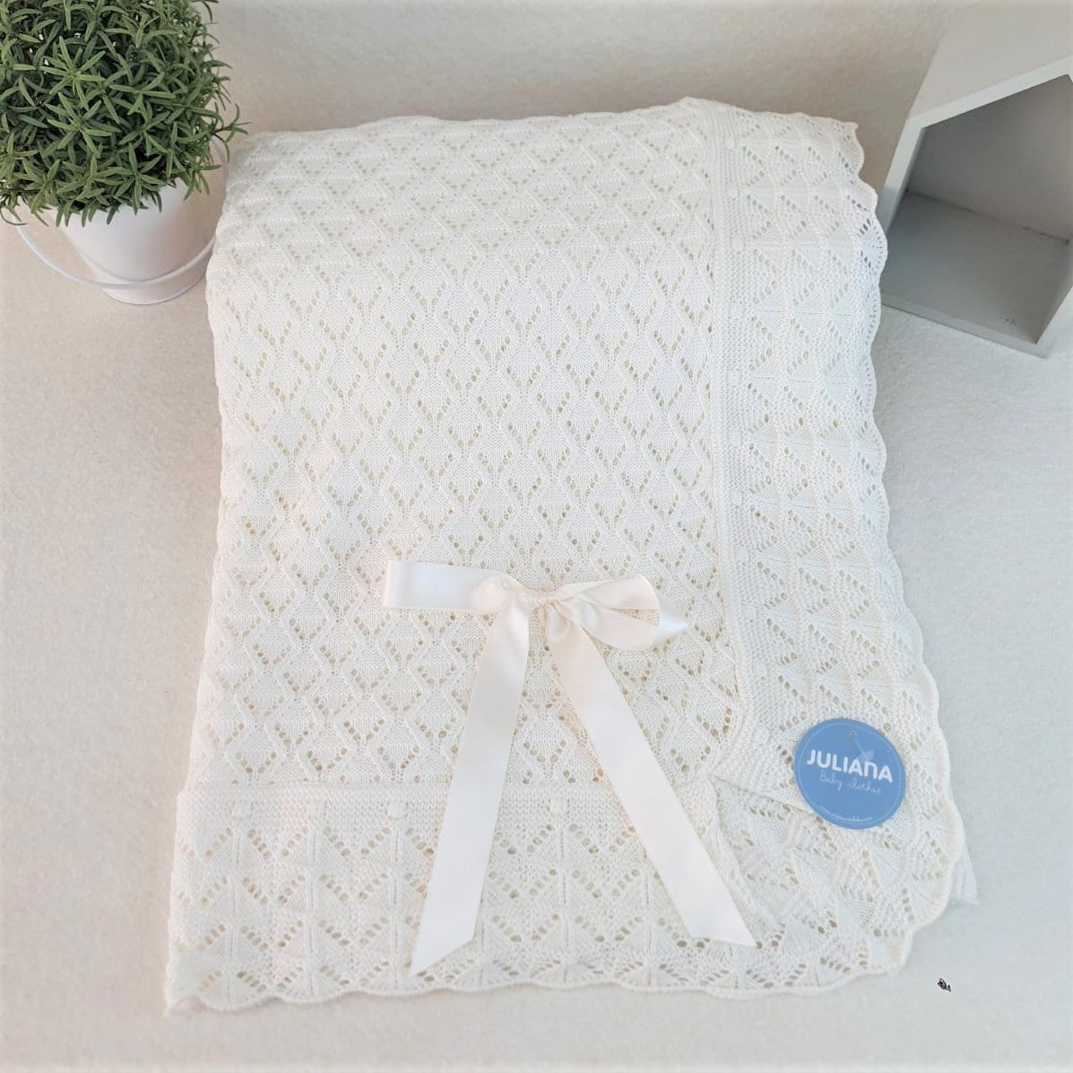 Toquilla de hilo para la estación de primavera / verano. Tiene un tacto muy agradable, y es ideal para cubrir o enrollar a tu bebé recién nacido.