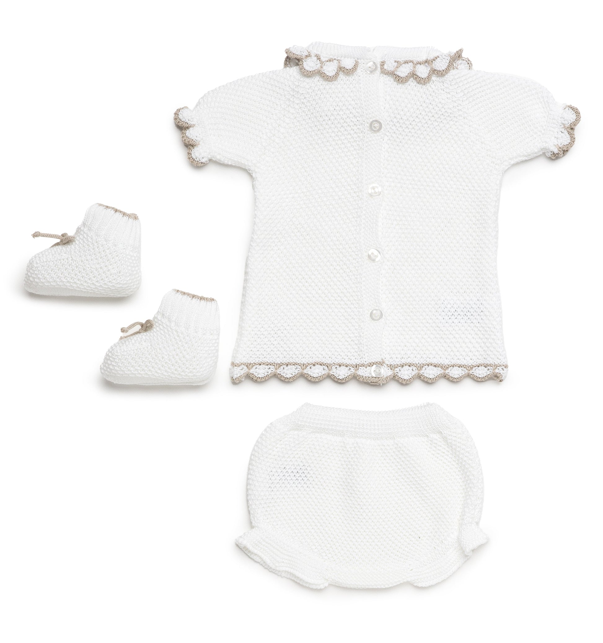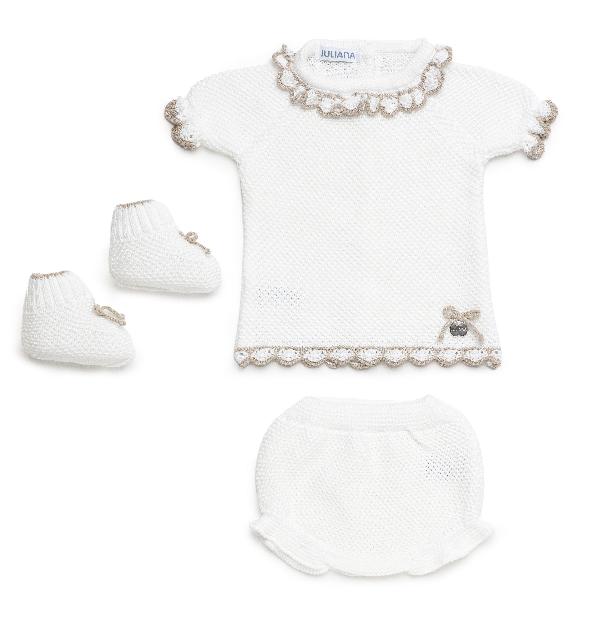 Conjunto de hilo de dos piezas con braguita y manga corta en blanco con detalles en beig, incluye patucos a juego.