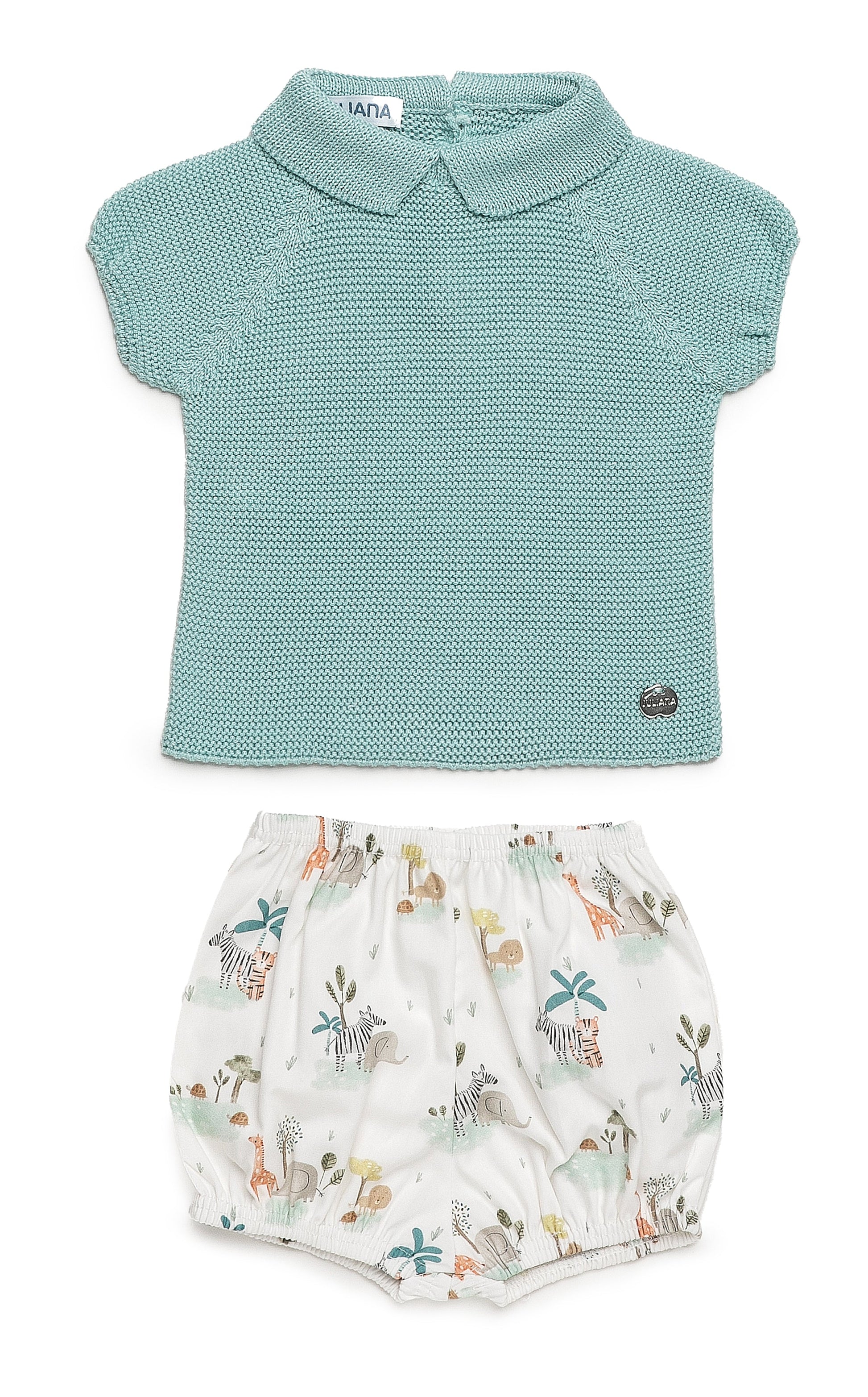 Conjunto de dos piezas con braguita de tela de de animalitos tipo safari y cuerpo en verde mint.