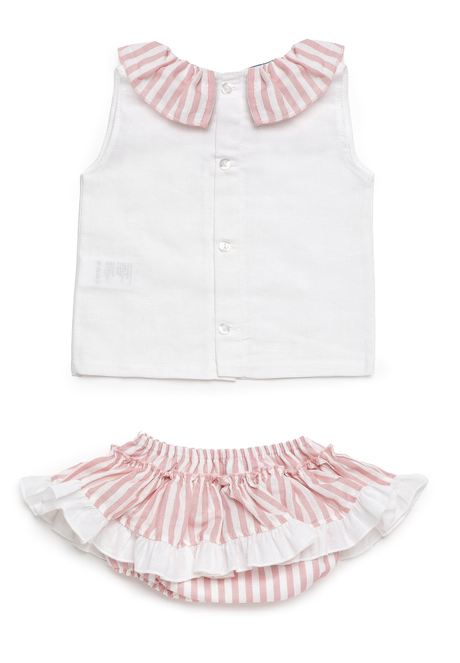 Conjunto de dos piezas con blusa con volante en el cuello con rayitas y braguita a juego.