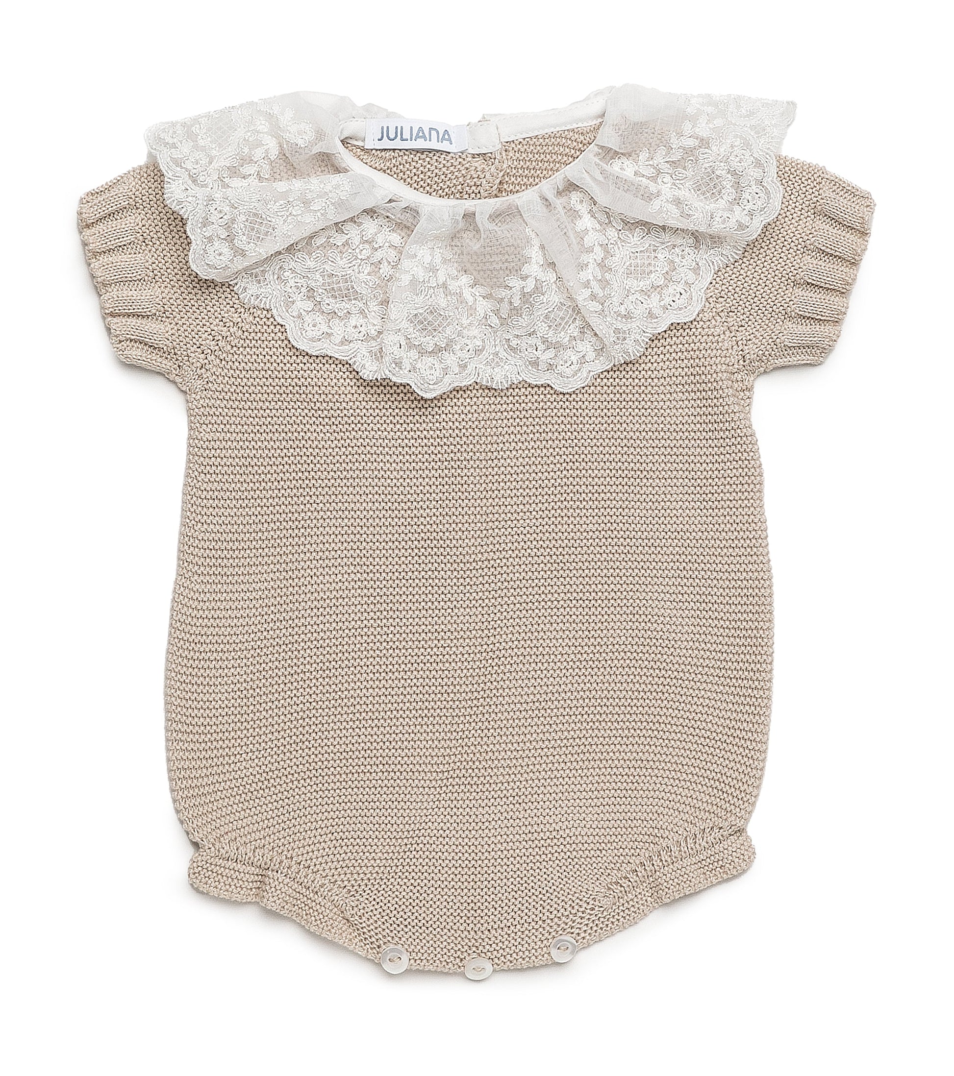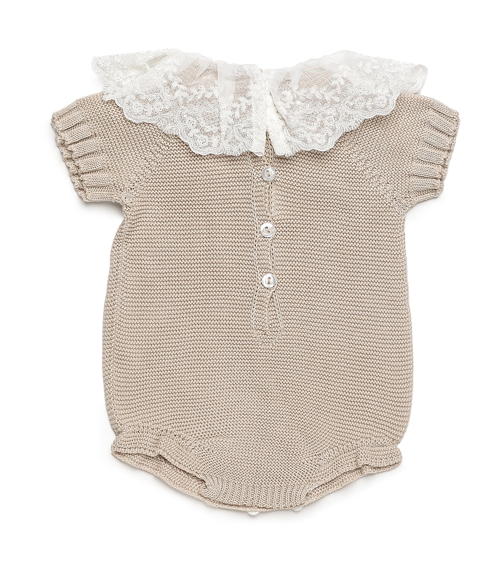 Pelele entero de punto con puntilla en el cuello.