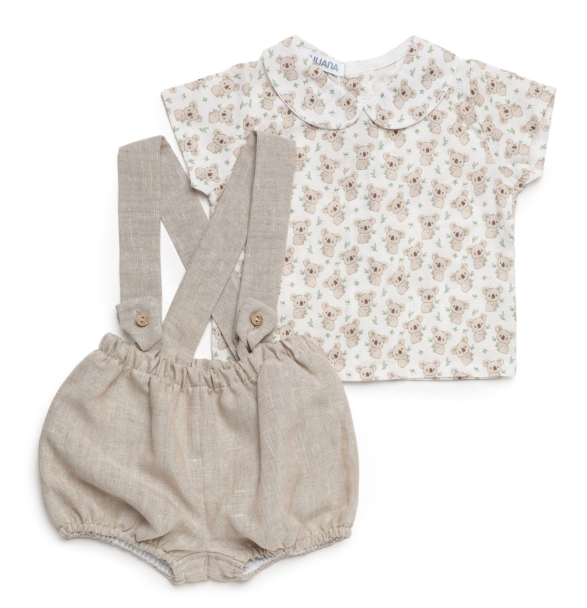 Peto de lino en tono tostado combinado con camisa de koalas.