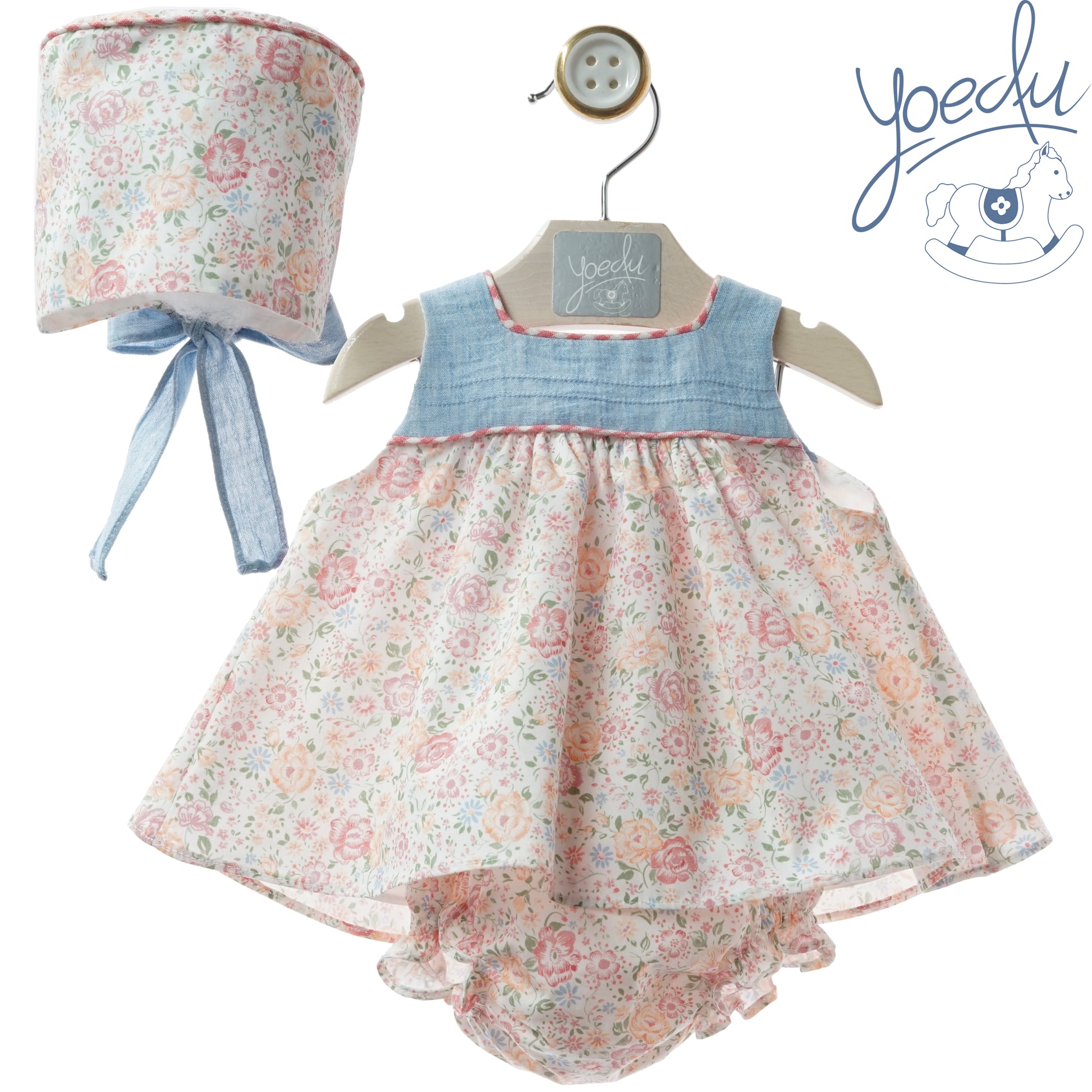 Jesusín con braguita y capota con estampado de flores en el que predomina el color coral.