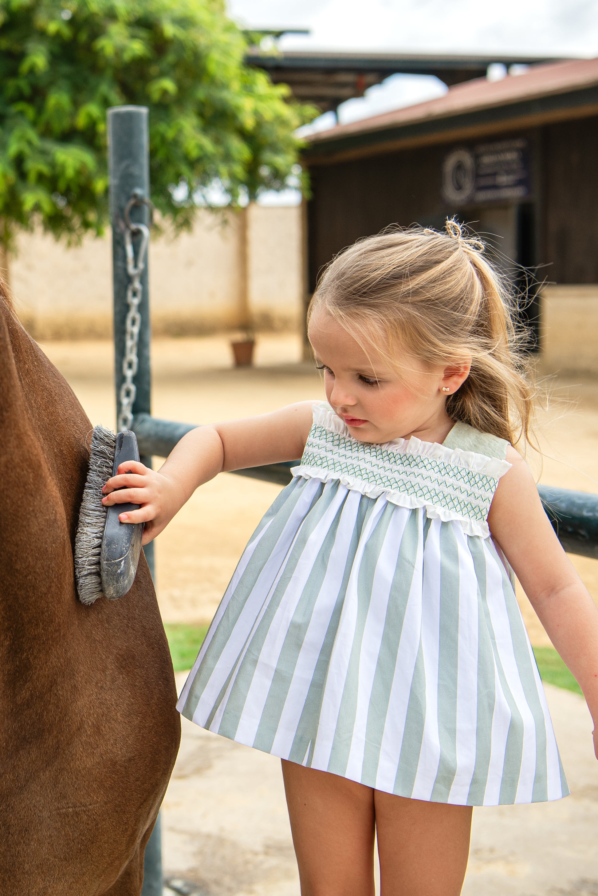 Jesusín de rayas verdes y blancas con pechera de nido de abeja.