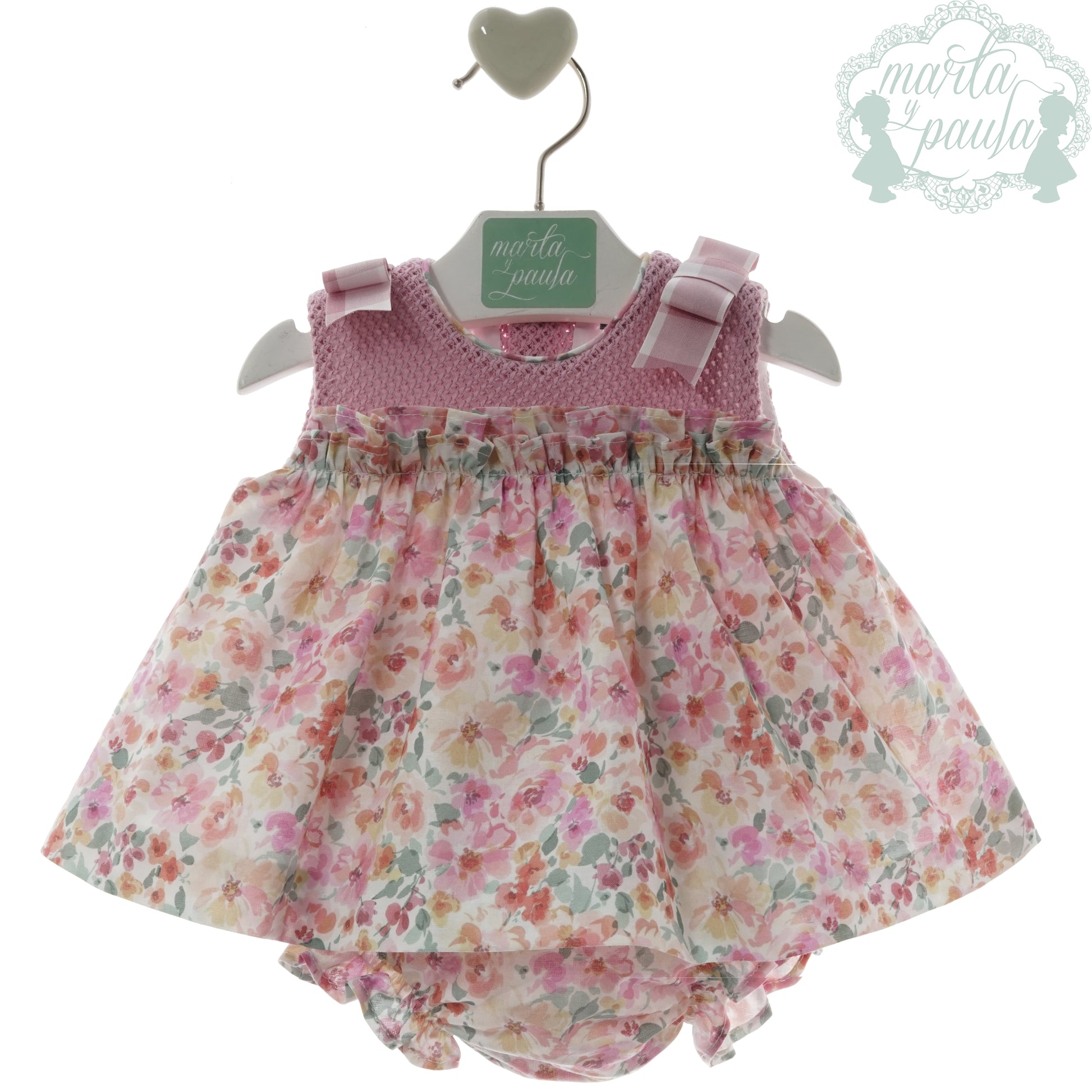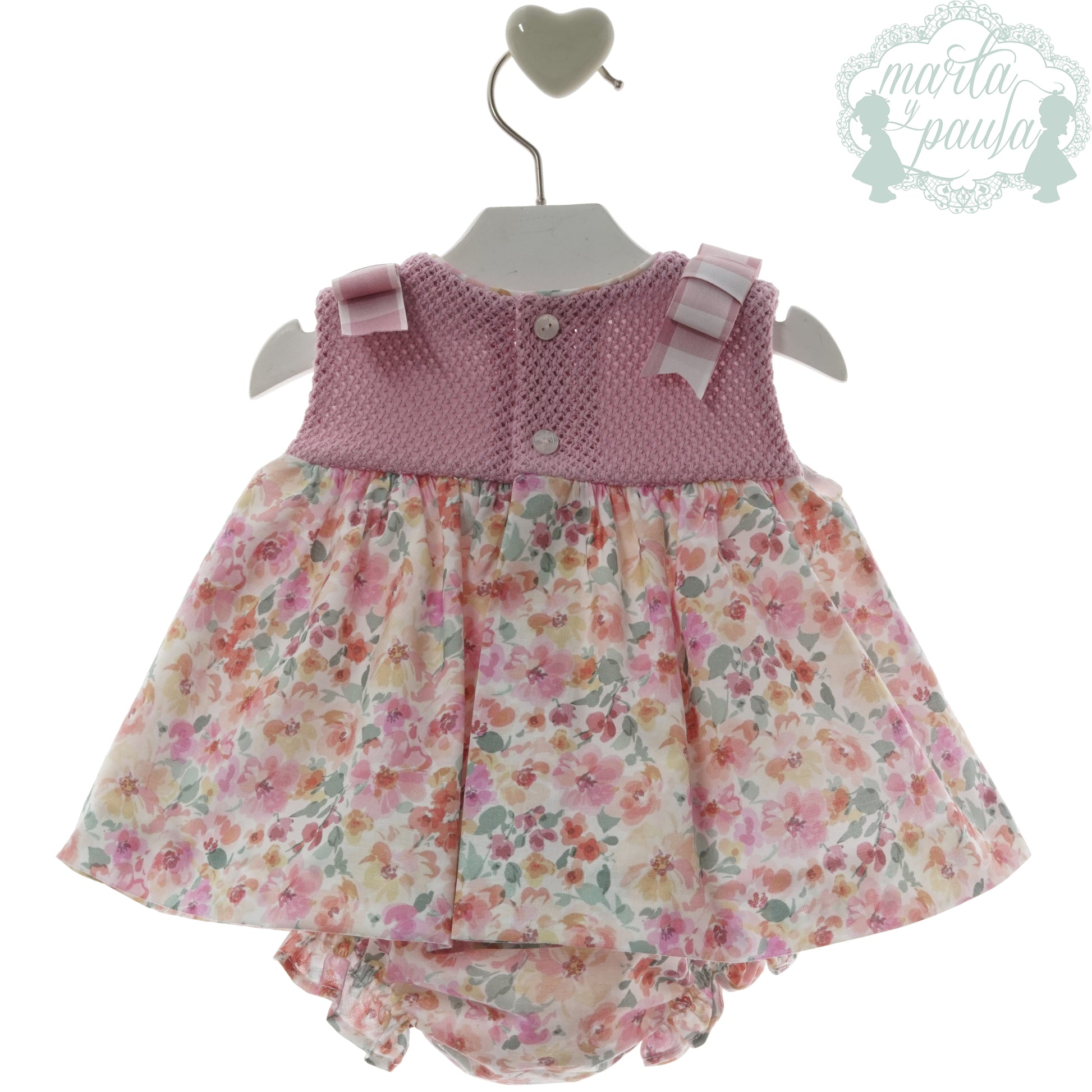 Jesusín con estampado de flores en tonos rosa y parte superior de crochet.