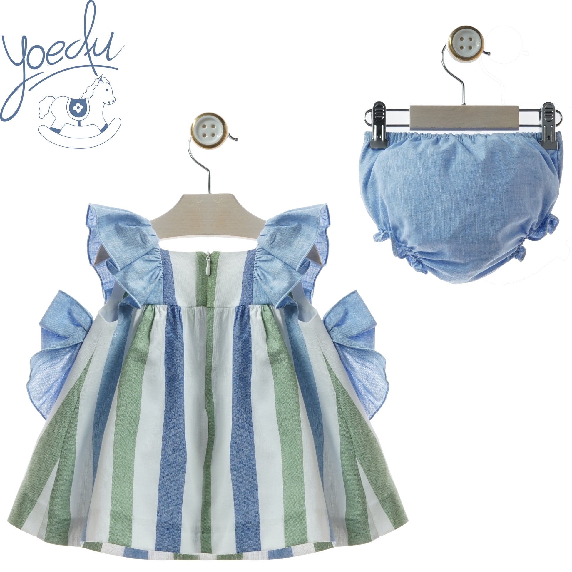 Vestido de bebé con braguita. A rayas azul, verde y blanco, con lazos en los laterales y volante en los hombros.