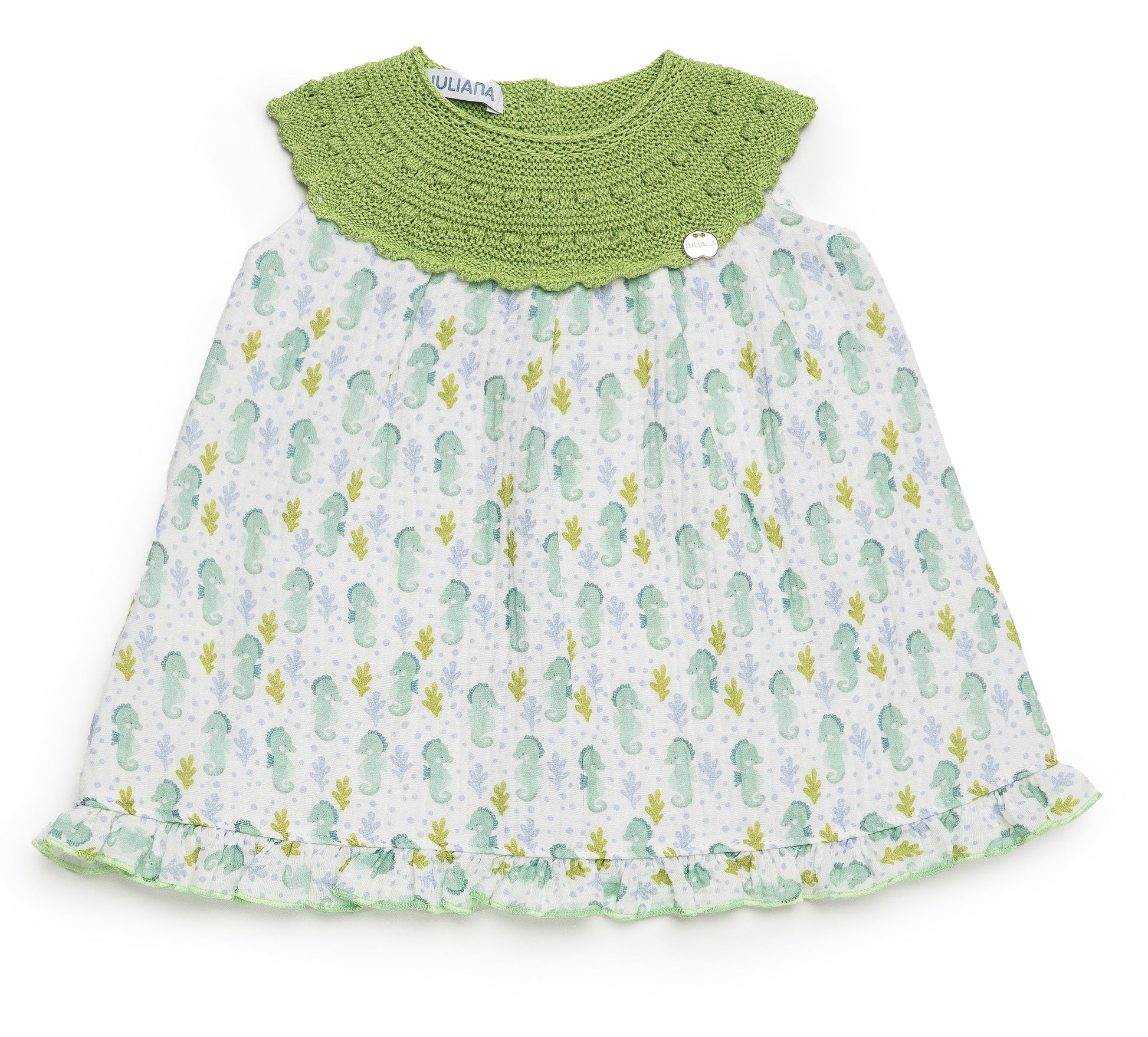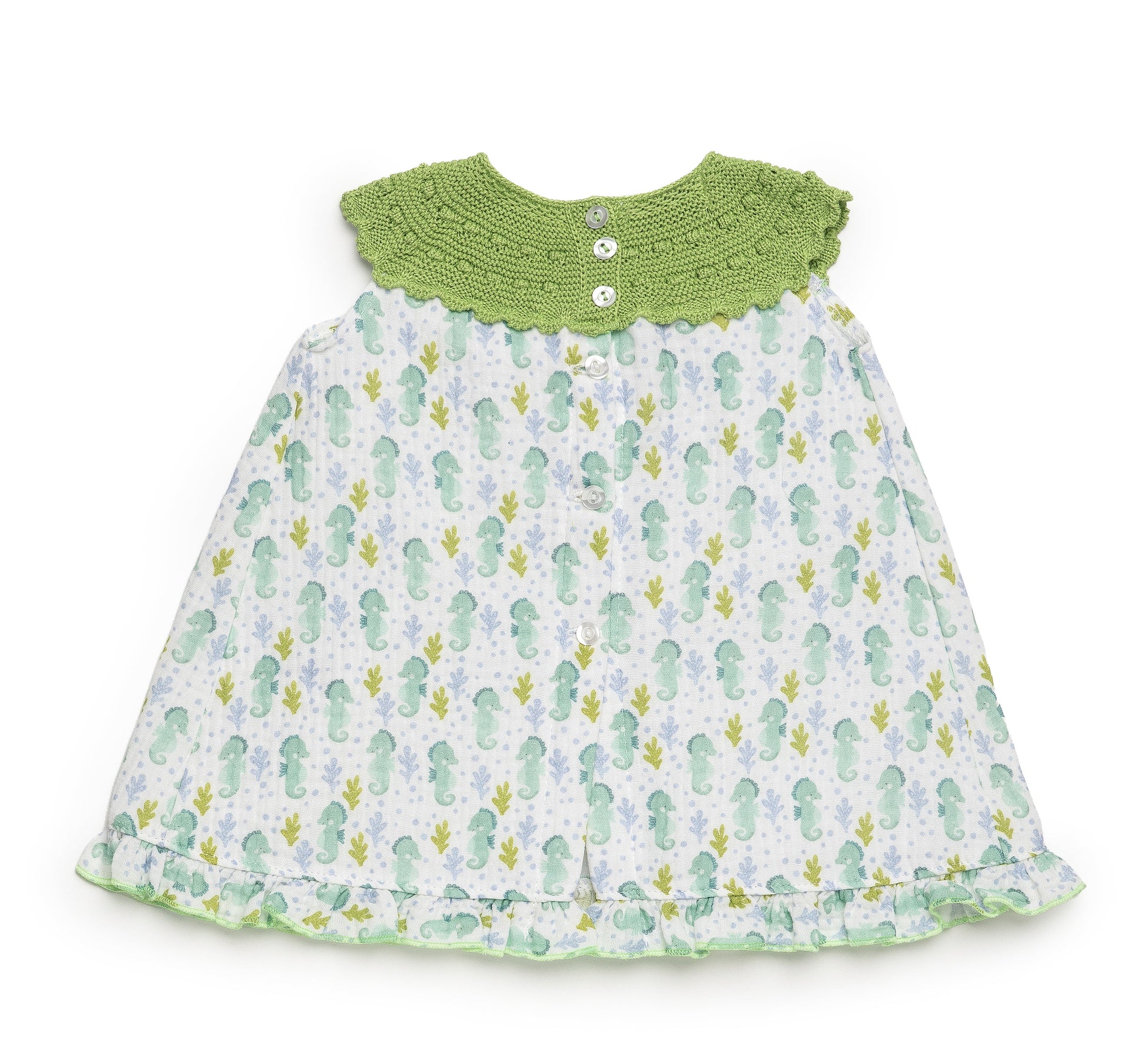 Vestido cuerpo de punto en verde lima y tela de caballitos de mar